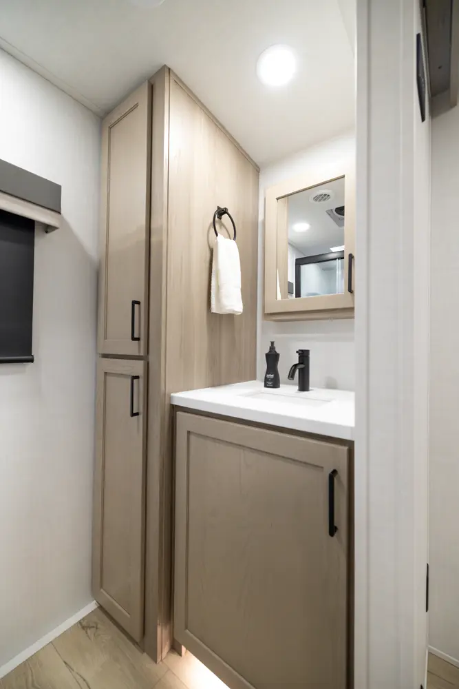 This travel trailer has everything you need and is still under 30'! This unit offers a walk around 60"x 80" queen bed, night stands on either side, and a big wardrobe slide. The 67" theater seating and the 44" dinette slide out giving the kitchen and living room area an open feeling. The rear bathroom and front bedroom are equipped with big 36" sliding doors allowing for comfortable entry and exit.