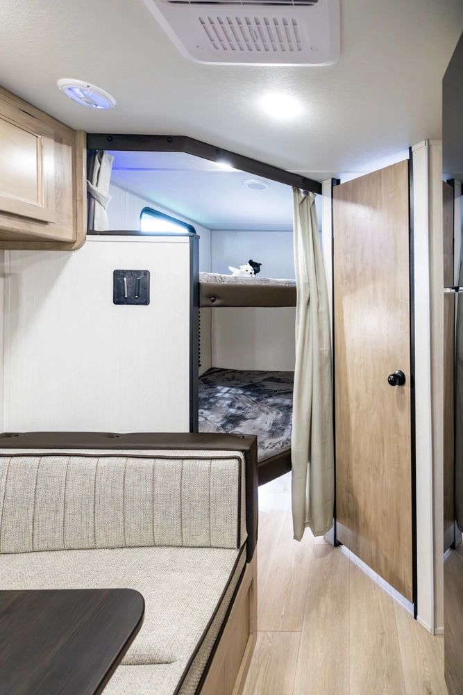 The Grey Wolf 22MKSE by Forest River is a compact and versatile travel trailer, perfect for families. The innovative Cherokee Sleep System bed transforms from a sofa into a queen-size bed, maximizing space and flexibility. The rear bunkhouse provides additional sleeping space for kids or guests. Indoor and outdoor entertainment options, along with modern amenities, make the 22MKSE a comfortable and convenient choice for family adventures.