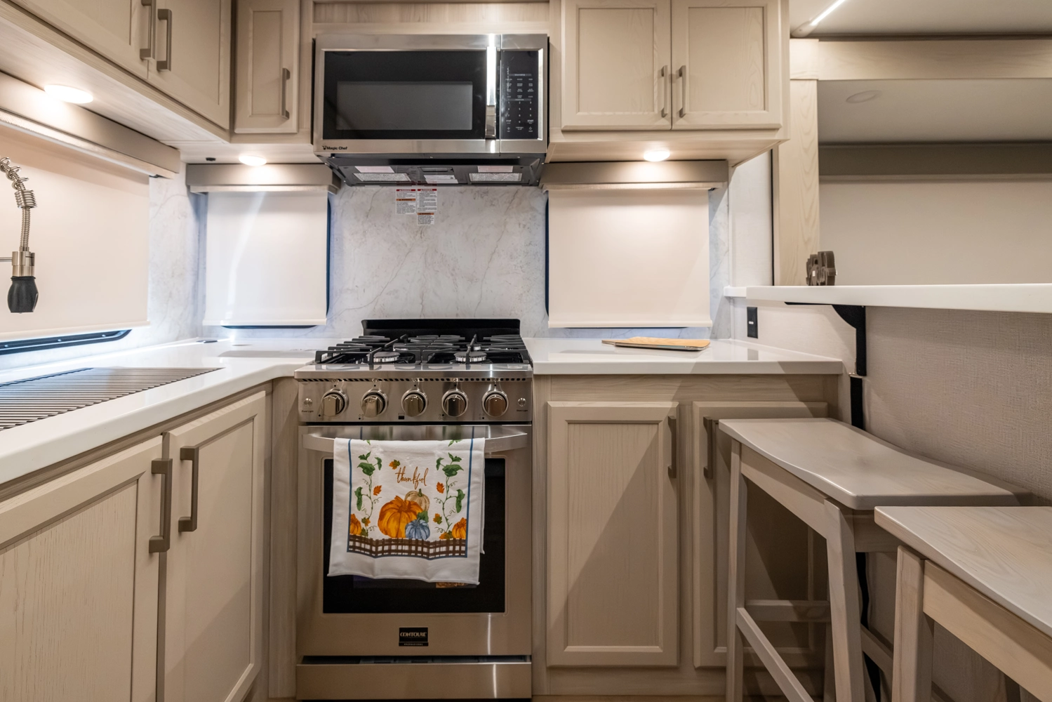 • Stainless Steel Appliance Pkg including 18 cu ft. 12V Refer, 1.7 Cu Ft Microwave and Residential Style 24" Range